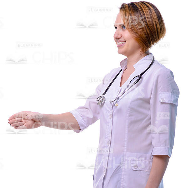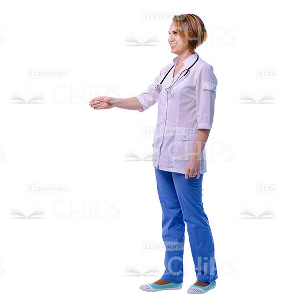 Full-sized cutout image of a good-looking young woman standing in a half turn. She stretches out her right hand while makes a greeting gesture. Looks happy and smiling. Could be used to illustrate the female health professional. We collect a variety of cut out people photos to provide an ability to the customers create an original visual story. You may use all of these photos in presentations, elearning courses or any other web-designed project. Each image is available in few different sizes to fit the needs of any client.