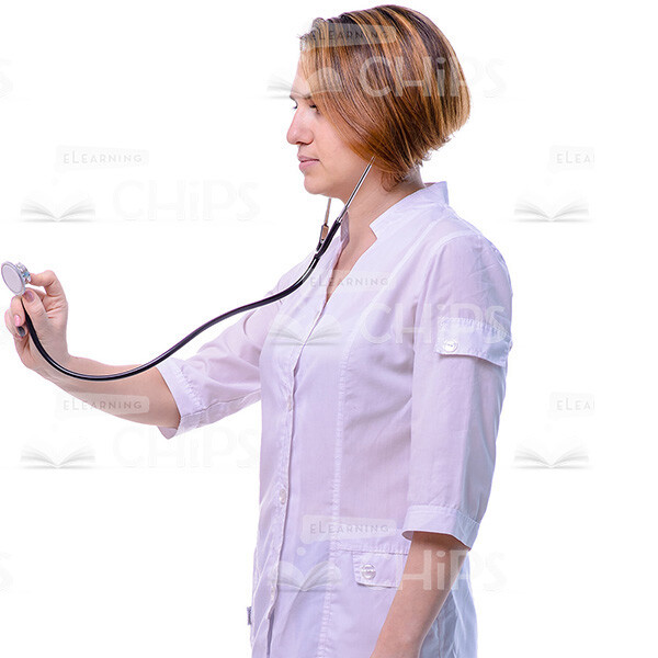 Full-sized cutout image of a good-looking physician standing in a half turn. She is using the stethoscope to examine a patient. Looks serious and concentrated on her current task. Could be used to illustrate the female health professional. We collect a variety of cut out people photos to provide an ability to the customers create an original visual story. You may use all of these photos in presentations, elearning courses or any other web-designed project. Each image is available in few different sizes to fit the needs of any client.