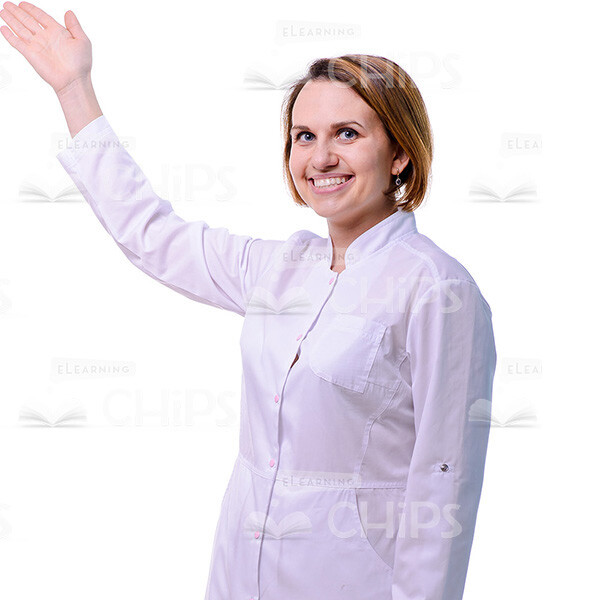 Full-sized cutout image of a happy young woman wearing white medical gown. She is raising up her right hand while pointing at something. It seems that she is holding a presentation. The cut out photo can be used to illustrate a female health professional in elearning projects. It is available in several different sizes: S, M, L and XL. The availability of the transparent background allows you just to insert a photo into the project slide without any further processing. Feel free to choose the format that suits you best and start to create your own e-course with our attractive cut out people photos.