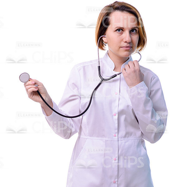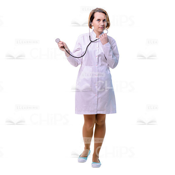 Full-sized cutout picture of a pretty young doctor wearing a white medical gown. She is taking off the medical stethoscope while holding it with both hands. It seems that she’s already finished the examination of a patient. The cut out photo can be used to illustrate a female health professional in elearning projects. It is available in several different sizes: S, M, L and XL. The availability of the transparent background allows you just to insert an image into the project slide without any further processing. Feel free to choose the format that suits you best and start to create your own e-course with our attractive cut out people photos.