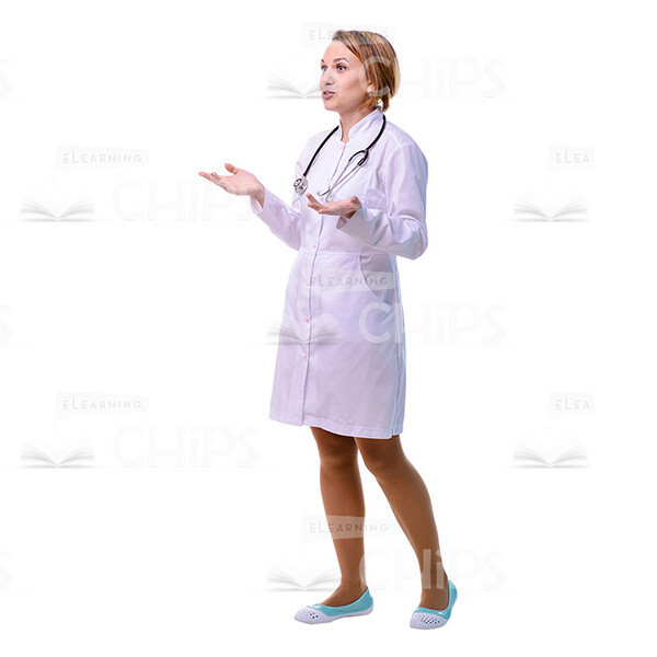 Full-length cutout picture of a half-turned doctor standing upright. She is gesticulating with both hands while explaining something to a patient. Looks nice and friendly. The cut out photo is available in several various sizes to fit the requirements of each customer. It can be used in web and print related projects such as elearning courses, presentations, promotions, etc. Our huge cutout people photo library contains a large number of high-quality pictures taken by professional photographer. Feel free to pick any item(s) you need to create an eye-catching project.