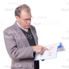 High-quality cutout image of focused mid aged man standing sideways while pointing on folder with his finger presenting some visual information. Perfectly describe a person involved in educational process. Could be used in various presentations and e-learning modules. Wearing classic business suit. The whole pack include a variety of poses and emotions. All photos were taken from multiple angles and available with transparent backgrounds. This will save you from routine work during e-course development.