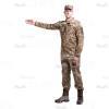 High-quality cutout photo of a handsome young soldier standing full face. His eyes are directed at the camera. He is standing with the raised stretched right arm and showing to the right. A man is dressed in military uniform such as black boots, camouflage pants, jacket and patrol cap. We’ve collected thousands of cutout people photos, with dozens of different poses, gestures and emotions. All images are represented over the transparent background, so there is no need for additional processing. Just choose the picture(s) you need and start to create your own training courses.