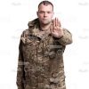 High-quality cutout photo of a handsome young soldier. We have a full-length photo. He is standing full face. His eyes are directed at the camera. He is serious. His left hand is raised in front of him with stop gesture. His legs are set apart. A man is dressed in military uniform such as black boots, camouflage pants and jacket. The photo would be useful for creating web-design projects (e learning courses, presentations, marketing messages, etc.). All of our high quality photos are available in various sizes to use according to your requirements. This high resolution picture is available with transparent backgrounds that help you to create the most effective e-course. We have cutout images of the people in different poses, gestures and facial expressions.