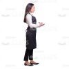 - Style: waitress uniform, black apron, white blouse, dark pants;