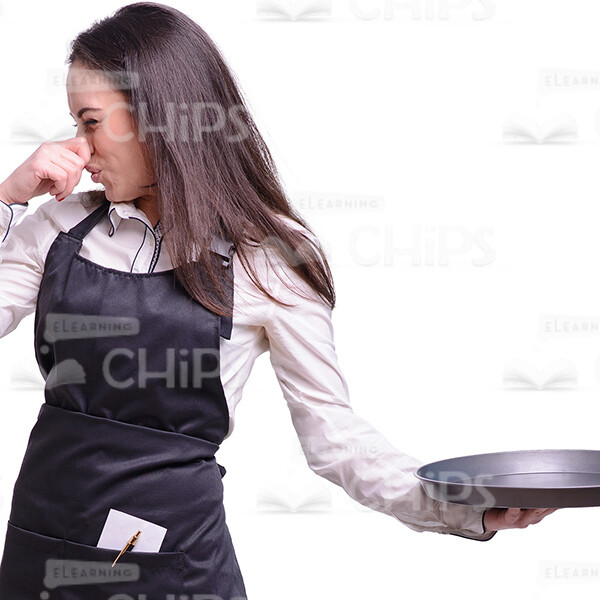 - Appearance: European, young woman, lady, girl, adult, female, black hair, long hairstyle, waitress, cook, catering employee, worker, staff, professional, service, culinary, restaurant, waiter, handsome, nice, glad, cute, beautiful, pretty, good-looking, attractive, covering nose, outstretched hand, half-turned, face in profile, indignant, dissatisfied, displeased, emotional, with round tray, holding empty tray;
