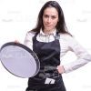 - Appearance: European, young woman, lady, girl, adult, female, black hair, long hairstyle, waitress, cook, catering employee, worker, staff, professional, service, culinary, restaurant, waiter, handsome, nice, glad, cute, beautiful, pretty, good-looking, attractive, with round tray, holding empty tray, presenting, focused, calm, serious, concentrated, hand on waist;