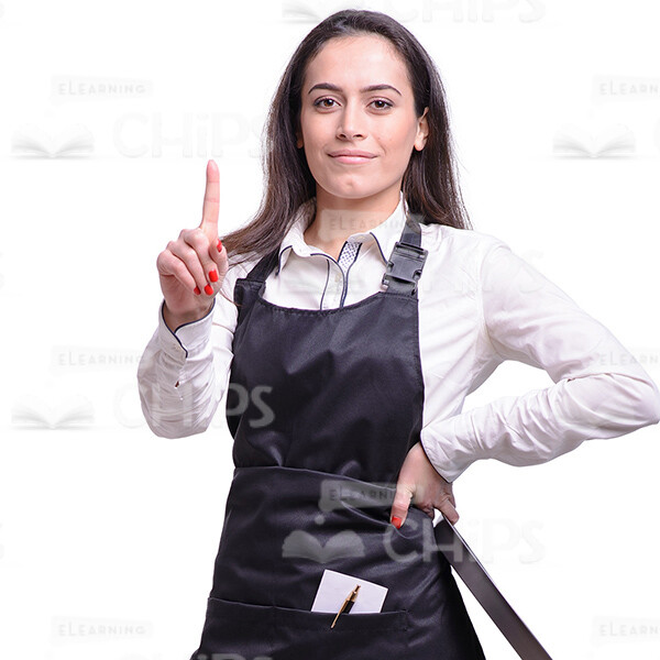 Full-length cutout photo of a nice young waitress gesturing with a right hand. She is pointing upwards while holding a round tray. Looks cheerful and smiling. This handsome female cut out character would become a great addition to e-learning projects. The picture is represented with the transparent background, so there is no need for its further processing. Available in few various sizes to fit the needs of any customer.