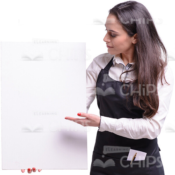 Full-length cutout photo of a handsome young woman holding a white board with her right hand. She is pointing at it with a left hand. Looks like that lady is holding a presentation. Dressed in the black waiter’s apron, white blouse and dark pants. The cut out photo can be used to illustrate a nice female character in any kind of web or print related project. The availability of a transparent background allows you just to drop the image over the project slide, without any further processing. The item is available is few different sizes to fit the requirements of any customer. Just choose the size you need and start to create your own visual story.