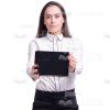 Full-sized cutout picture of a handsome young woman holding a tablet with both hands in front of her. She is showing it on a camera. Looks like that a lady is holding a presentation. The image would be a great choice to illustrate an attractive female character dressed in classic clothes. It is useful for any kind of web and print related projects such as elearning courses, presentations, marketing messages, etc.