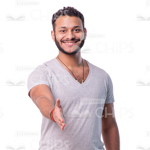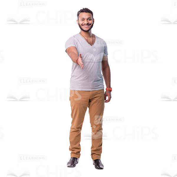 High-quality cutout image of a handsome latin young man making a greeting gesture. He is looking friendly while welcoming his companion. Dressed in casual clothes: beige pants and grey t-shirt. Image can be used in e-learning courses, advertisements and marketing projects. There are lots of photos of this model from multiple angles with various emotions and postures. All of them are presented with transparent backgrounds that help you to create the most effective e-course. Our cutout people images are available in a several formats. Feel free to choose the most suitable for your needs.