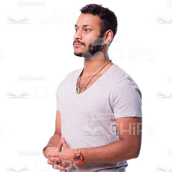 High-quality cutout image of a half-turned young man. He looks focused and concentrated. It seems that he is listening to the narrator. His hands are crossed, eyes are directed to someone else. Dressed in casual clothes: beige pants and grey t-shirt. Image can be used in e-learning courses, advertisements and marketing projects. There are lots of photos of this model from multiple angles with various emotions and postures. All of them are presented with transparent backgrounds that help you to create the most effective e-course. Our cutout people images are available in a several formats. Feel free to choose the most suitable for your needs.