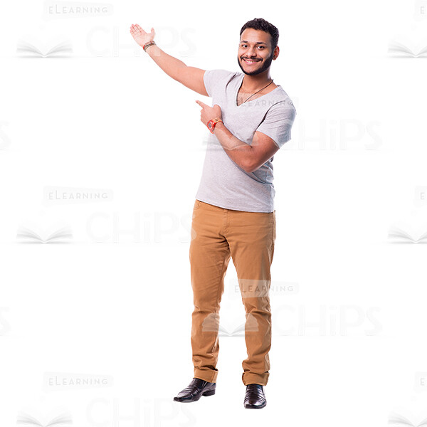 High-quality cutout image of a latino young man in presenting pose. He is pointing with both hands on some object behing him. Man looks pleasant and cheerful. His eyes are directed at the camera. Wears beige pants and grey t-shirt. This handsome character can be used in e-elearning projects as tutor, course narrator or casually dressed learner. Image is also suitable for use in marketing projects and advertisements.