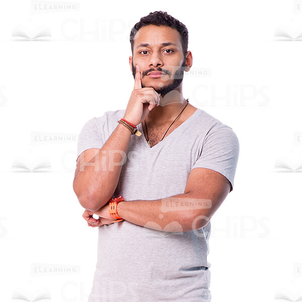 High-quality cutout photo of a latino young man standing straight. He looks thoughtful and focused while touches a hand to his chin. His eyes are directed at the camera. Wears beige pants and grey t-shirt. This handsome character can be used in e-elearning projects as tutor, course narrator or casually dressed learner. Image is also suitable for use in marketing projects and advertisements.