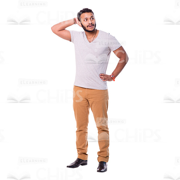 High-quality cutout photo of a thoughtful young man standing upright. He looks very discouraged. He holds on the nape with right hand while a left hand is on his belt. Wears beige pants and grey t-shirt. This handsome character can be used in e-elearning projects as tutor, course narrator or casually dressed learner. Image is also suitable for use in marketing projects and advertisements.