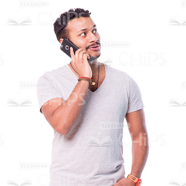 High-quality cutout photo of a Latin American young man speaking by mobile phone. He looks relaxed, fun and slightly surprised. Wears beige pants and trendy t-shirt. This image would perfectly illustrate a student or casually dressed tutor during learning process.