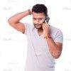 High-quality cutout image of a discouraged latino man. He talks on mobile phone while puts his hand on a head. Looks thoughtful and worried. Wears beige pants and trendy t-shirt. This image would perfectly illustrate a student or casually dressed tutor during learning process.