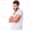 High-quality cutout photo of a latin young man. He is looking playfully while crossing his arms. Eyes are directed at the camera. Image can be used in advertisements, e-learning and marketing projects. It would ideally illustrate a modern learner or casually dressed narrator.