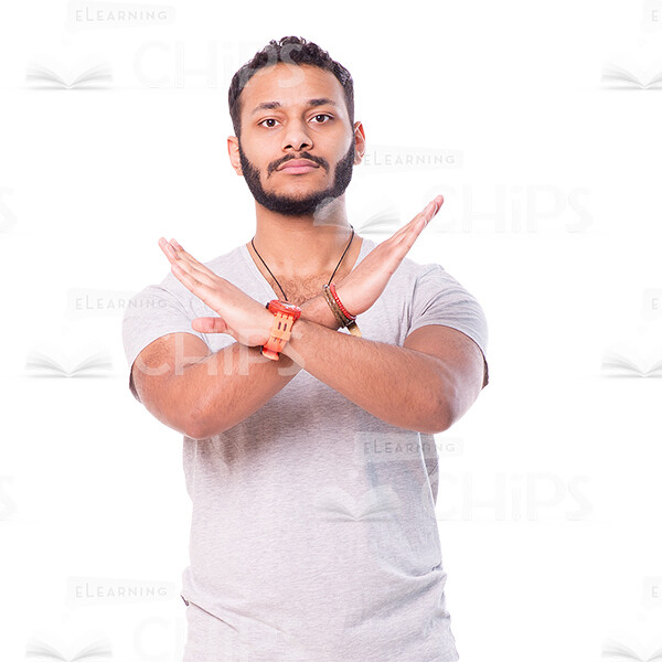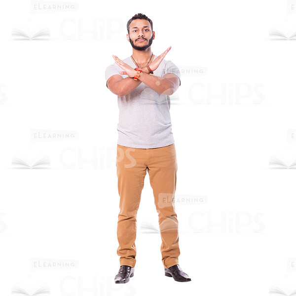 High-quality cutout photo of a handsome latino man making “don’t do it” gesture. He looks focused and convinsing. His eyes are directed at the camera. Wears beige pants and grey t-shirt. Would perfectly illustrate a narrator, tutor or casually dressed student during learning process. Transparent background allows to quickly drag and drop it into your own e-course.