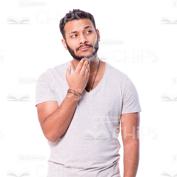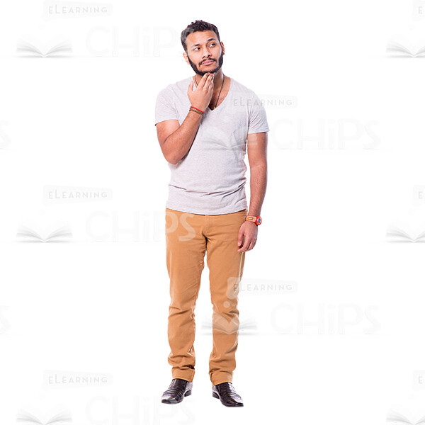 High-quality cutout picture of a pensive young man. Looks like he is thinking about the future plans. Dressed in beige pants and a grey t-shirt. Would perfectly illustrate a young casually dressed learner or lecturer during studying process.