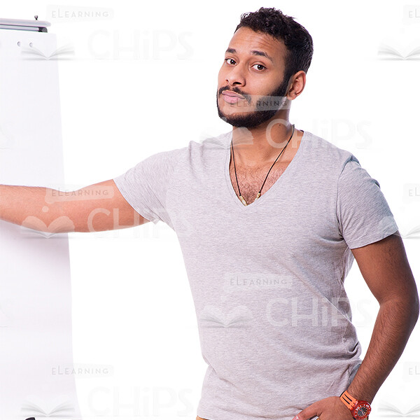 Full-length cutout photo of a young man making a presentation. He is standing near the vertical flipchart and pointing on it with his right hand. His eyes are directed at the camera. Dressed in beige pants and a grey t-shirt. Would perfectly illustrate a young casually dressed learner or lecturer during studying process.