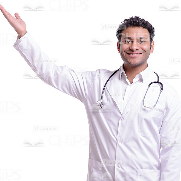 Cheerful Doctor Smiles And Points Upwards Cutout Picture