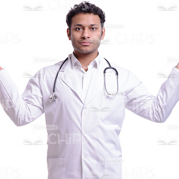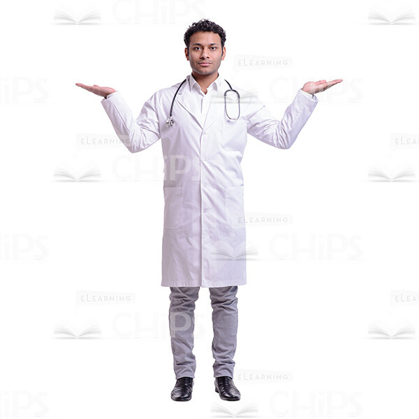 - Appearance: Latin American, male, young man, guy, dark hair, short haircut, doctor, medical, health, professional, medicine, practitioner, physician, surgeon, care, treatment, attractive, nice, good-looking, with stethoscope, with phonendoscope, presenting, scales, hands wide apart, showing, holding presentation, gesture, gesturing, calm, focused, concentrated;