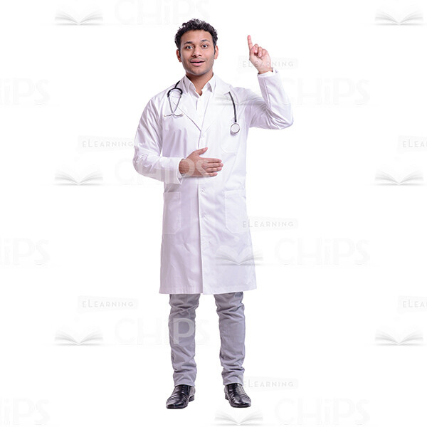 Cutout Photo of Young Doctor Holding Hand at His Stomach and Pointing Up
