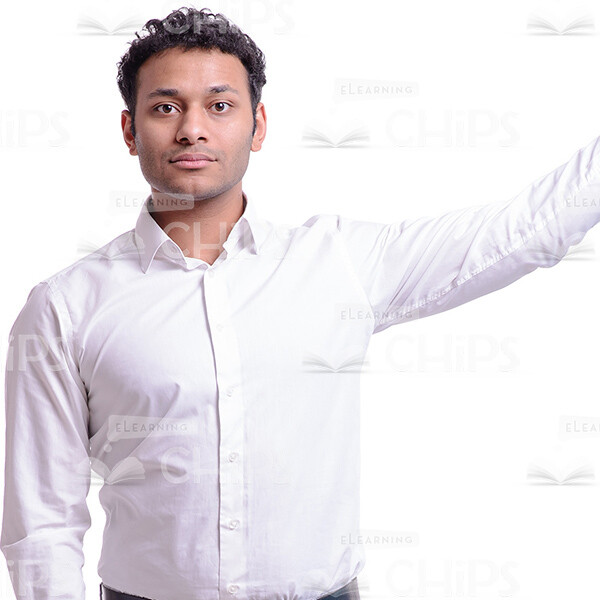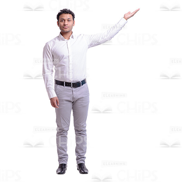 The high-quality cutout image of the young, attractive businessman. We have the full-length photo. He is standing full face. He is looking at the camera. He has raised and stretched his left arm. He is pointing on something. He is calm. The man is dressed in the white shirt and grey jeans. He has black shoes and black belt. The man is Latin American and he has the dark hair with short haircut. This handsome cutout character provides you more opportunities to create an interesting visual story.