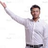 The high-quality cutout image of the young, attractive businessman. We have the full-length photo. He is standing full face. He is looking at the camera He has raised and stretched his right arm. He is pointing on something. The man is dressed in the white shirt and grey jeans. He has black shoes and black belt. The man is Latin American and he has the dark hair with short haircut. This handsome cutout character provides you more opportunities to create an interesting visual story.