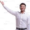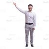 The high-quality cutout image of the young, attractive businessman. We have the full-length photo. He is standing full face. He is looking at the camera He has raised and stretched his right arm. He is pointing on something. He is smiling.The man is dressed in the white shirt and grey jeans. He has black shoes and black belt. The man is Latin American and he has the dark hair with short haircut. This handsome cutout character provides you more opportunities to create an interesting visual story.