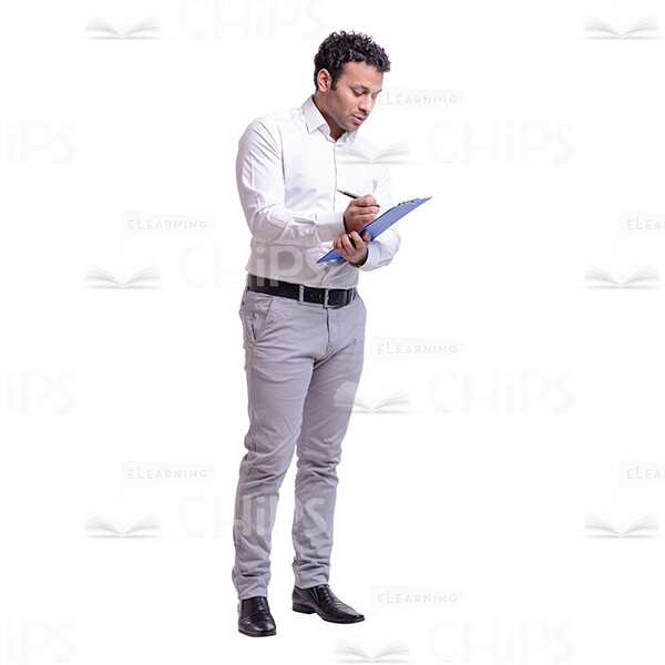 The high-quality cutout image of the young, attractive businessman. We have the full-length photo. He is standing half-turned full face. He is making notes. He has the pen in his right hand and the notebook in his left hand. He is looking at his notes. He is attentive and concentrated. He is looking at the camera The man is dressed in the white shirt and grey jeans. He has black shoes and black belt. The man is Latin American and he has the dark hair with short haircut. This handsome cutout character provides you more opportunities to create an interesting visual story.