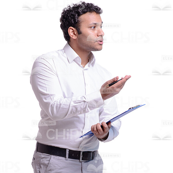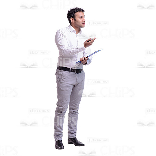 The high-quality cutout image of the young, attractive businessman. We have the full-length photo. He is standing half-turned full face. He is talking to somebody. He has the pen in his right hand and the notebook in his left hand. He is looking at someone with whom he is talking. He is attentive and concentrated. The man is dressed in the white shirt and grey jeans. He has black shoes and black belt. The man is Latin American and he has the dark hair with short haircut. This handsome cutout character provides you more opportunities to create an interesting visual story.