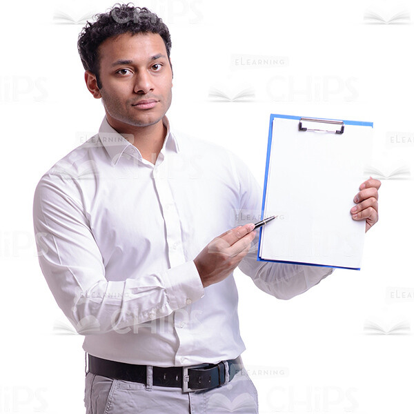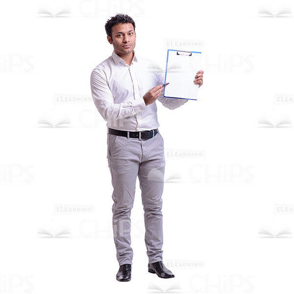 The high-quality cutout image of the young, attractive businessman. We have the full-length photo. He is standing full face. He is looking at the camera. He is serious and attentively looking at the camera. He has the pen in his right hand with which he is pointing on his notebook in his left hand. The man is dressed in the white shirt and grey jeans. He has black shoes and black belt. The man is Latin American and he has the dark hair with short haircut. This handsome cutout character provides you more opportunities to create an interesting visual story.
