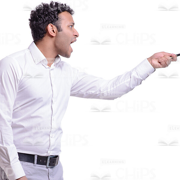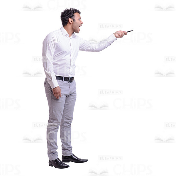 The high-quality cutout image of the young, attractive businessman. We have the full-length photo. He is standing in profile view. He is turned to the right. He is not looking at the camera. He has stretched in front his left arms with pen and pointing with it. He is gesticulating. He is shouting. He is angry. The man is dressed in the white shirt and grey jeans. He has black shoes and black belt. The man is Latin American and he has the dark hair with short haircut. This handsome cutout character provides you more opportunities to create an interesting visual story.