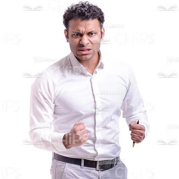 The high-quality cutout image of the young, attractive businessman. We have the full-length photo. He is standing full face. He is looking at the camera. He is very angry and aggressive. He has the threatening look. His hands are clenched in fists. He has squeezed the pen in his right hand. The man is dressed in the white shirt and grey jeans. He has black shoes and black belt. The man is Latin American and he has the dark hair with short haircut. This handsome cutout character provides you more opportunities to create an interesting visual story.