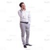 The high-quality cutout image of the young, attractive businessman. We have the full-length photo. He is standing full face. He is looking at the camera. He is talking with his handy. He is holding his handy with the right hand. He is smiling. He is glad. The man is dressed in the white shirt and grey jeans. He has black shoes and black belt. The man is Latin American and he has the dark hair with short haircut. This handsome cutout character provides you more opportunities to create an interesting visual story.