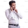 The high-quality cutout image of the young, attractive businessman. We have the full-length photo. He is standing full face. He is no looking at the camera. He is talking with his handy. He is looking disturbed and worried. He is holding his handy with the right hand and with his left hand he is touching his chin. The man is dressed in the white shirt and grey jeans. He has black shoes and black belt. The man is Latin American and he has the dark hair with short haircut. This handsome cutout character provides you more opportunities to create an interesting visual story.