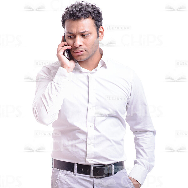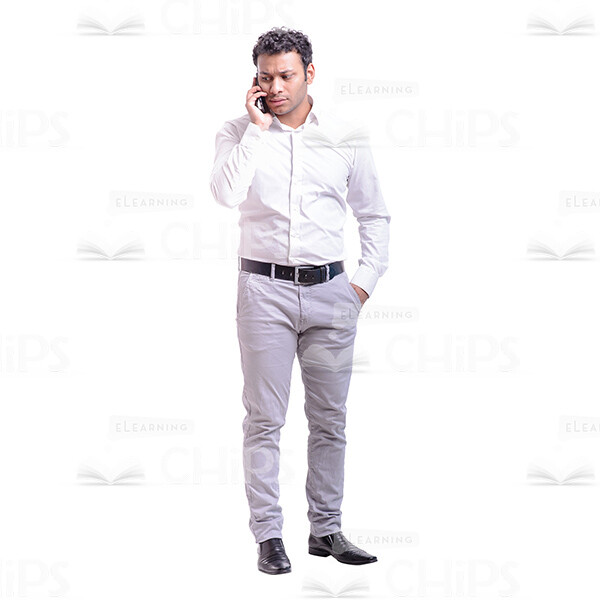 The high-quality cutout image of the young, attractive businessman. We have the full-length photo. He is standing full face. He is looking down and left. He is using his handy. He is looking disturbed and worried. He is holding his handy with the right hand and his left hand he is holding in the pocket. The man is dressed in the white shirt and grey jeans. He has black shoes and black belt. The man is Latin American and he has the dark hair with short haircut. This handsome cutout character provides you more opportunities to create an interesting visual story.