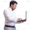 The high-quality cutout image of the young, attractive businessman. We have the full-length photo. He is standing with profile view. He is looking at the laptop. He is holding laptop on his left hand and typing with his right hand. He is surfing in the net. The man is dressed in the white shirt and grey jeans. He has black shoes and black belt. The man is Latin American and he has the dark hair with short haircut. This handsome cutout character provides you more opportunities to create an interesting visual story.