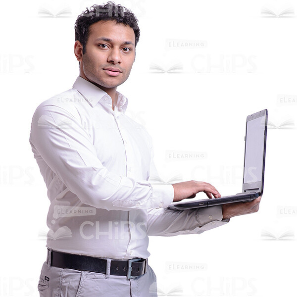 The high-quality cutout image of the young, attractive businessman. We have the full-length photo. He is standing with profile view. He is looking at the camera. He is holding laptop on his left hand and typing with his right hand. He is surfing in the net. The man is dressed in the white shirt and grey jeans. He has black shoes and black belt. The man is Latin American and he has the dark hair with short haircut. This handsome cutout character provides you more opportunities to create an interesting visual story.