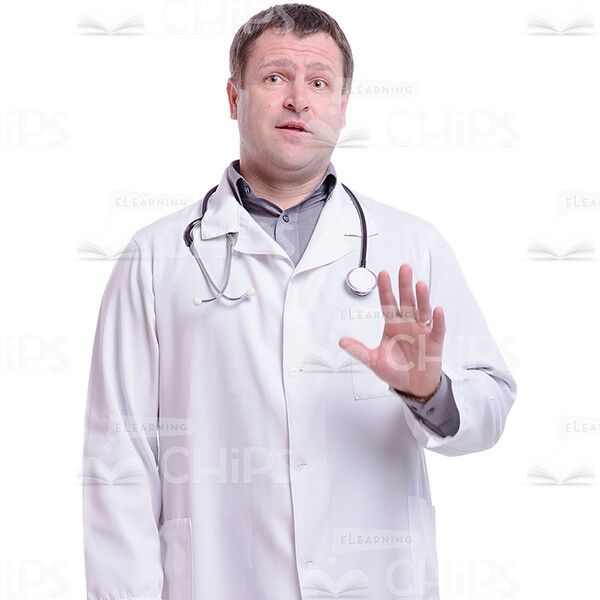 High-quality cutout image of a middle-aged man. He is a doctor. We have a full-length photo. He is standing full face. On his neck he has the stethoscope. His eyes are directed at the camera. He is serious. He raised his left hand with the stop gesture. He is talking, his mouth is slightly opened. The man is dressed in the white doctor’s smock. Under his doctor’s smock he has gray shirt and black pants and on his feet he has the black shoes. Man has dark hair. This handsome cutout character provides you more opportunities to create an interesting visual story.