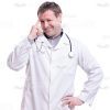 High-quality cutout image of a middle-aged man. He is a doctor. We have a full-length photo. He is standing full face. On his neck he has the stethoscope. He pressed his right hand finger to his forehead. He is looking up. He is smiling. He is thinking. He has a new idea. His left hand is set on his waist. The man is dressed in the white the doctor’s smock. Under his doctor’s smock he has gray shirt and black pants and on his feet he has the black shoes. Man has dark hair. This handsome cutout character provides you more opportunities to create an interesting visual story.