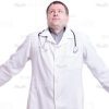High-quality cutout image of a middle-aged man. He is a doctor. We have a full-length photo. He is standing full face. On his neck he has the stethoscope. His both hands spread aside but not raised. He is looking up and right. He has pressed lips. He does not know what more to say. The man is dressed in the white the doctor’s smock. Under his doctor’s smock he has gray shirt and black pants and on his feet he has the black shoes. Man has dark hair. This handsome cutout character provides you more opportunities to create an interesting visual story.