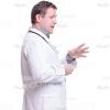 High-quality cutout image of a middle-aged man. He is a doctor. We have a full-length photo. We have the profile view. On his neck he has the stethoscope. He is standing. He holds his arms bent at the elbow in front of him and gesticulating. He is talking. The man is dressed in the white the doctor’s smock. Under his doctor’s smock he has gray shirt and black pants and on his feet he has the black shoes. Man has dark hair. This handsome cutout character provides you more opportunities to create an interesting visual story.
