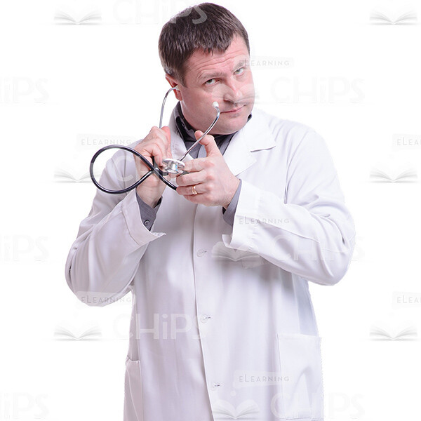 High-quality cutout image of a middle-aged man. He is a doctor. We have a full-length photo. He is standing full face. His eyes directed to the camera. He is looking at the camera. He has the stethoscope set in one ear and now with both hands he is checking it. The man is dressed in the white the doctor’s smock. Under his doctor’s smock he has gray shirt and black pants and on his feet he has the black shoes. Man has dark hair. This handsome cutout character provides you more opportunities to create an interesting visual story.