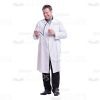 High-quality cutout image of a middle-aged man. He is a doctor. We have a full-length photo. He is standing full face. His eyes directed at the stethoscope. He has set the stethoscope in his ears holding it with right hand and looking at it. He is laughing. The man is dressed in the white the doctor’s smock. Under his doctor’s smock he has gray shirt and black pants and on his feet he has the black shoes. Man has dark hair. This handsome cutout character provides you more opportunities to create an interesting visual story.