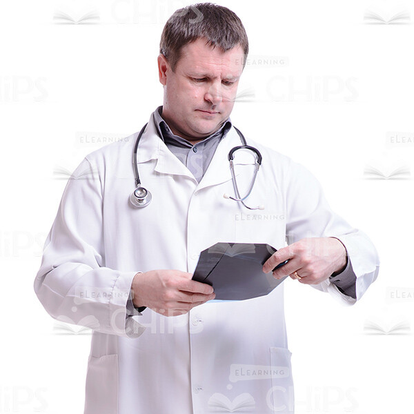 High-quality cutout image of a middle-aged man. He is a doctor. We have a full-length photo. He is standing full face. On his neck he has the stethoscope. His eyes directed down at the roentgen. He is holding the roentgen with both hands. He is looking serious. The man is dressed in the white the doctor’s smock. Under his doctor’s smock he has gray shirt and black pants and on his feet he has the black shoes. Man has dark hair. This handsome cutout character provides you more opportunities to create an interesting visual story.
