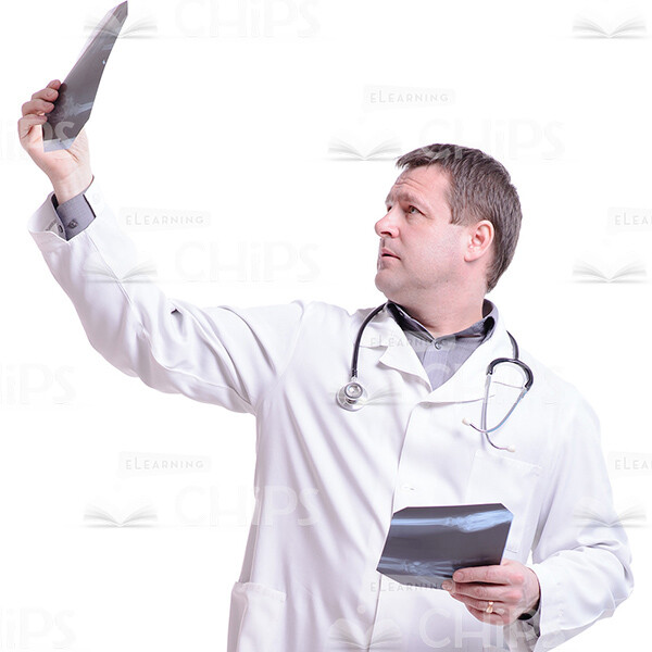 High-quality cutout image of a middle-aged man. He is a doctor. We have a full-length photo. He is standing full face. On his neck he has the stethoscope. His eyes directed up at the roentgen. He has two roentgens and holding one in each hand. He has raised his right hand with the roentgen and attentively looking at it. He is checking it. He is looking serious. The man is dressed in the white the doctor’s smock. Under his doctor’s smock he has gray shirt and black pants and on his feet he has the black shoes. Man has dark hair. This handsome cutout character provides you more opportunities to create an interesting visual story.