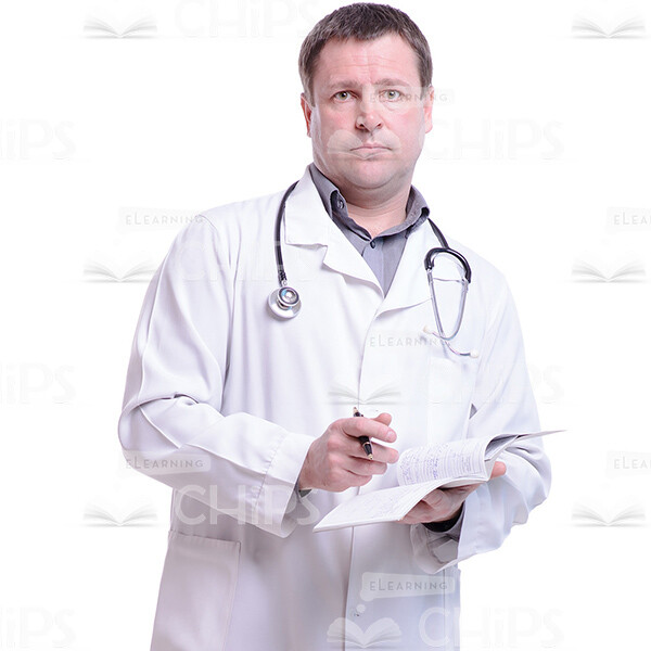 Cutout Picture of Serious Doctor Stopped Writing in a Health Card
